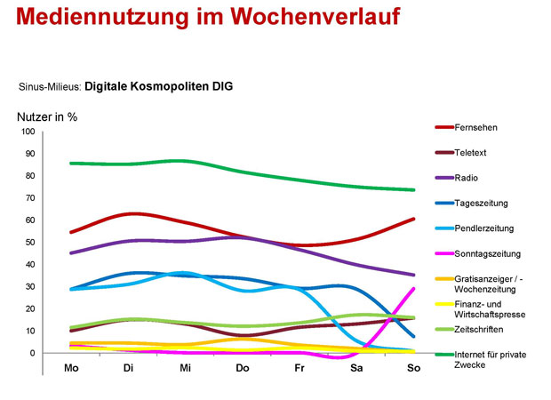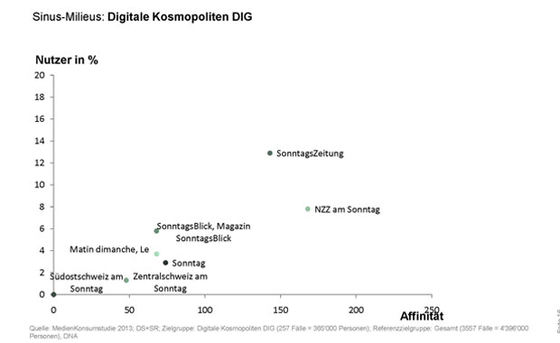 Christoph Müller, Generaldirektor von M.I.S Trend, dem Institut für Wirtschafts- und Sozialforschung, welches für die Sinus-Erhebung in der deutsch- und französischsprachigen Schweiz zuständig ist, verdeutlichte im Persönilch-Interview "Digitale Kosmopoliten" seien starke Individualisten und stets auf der Suche nach vielfältigen Erfahrungen, nach Selbstverwirklichung und Persönlichkeitswachstum, wobei Geld nicht der primäre Motivationsfaktor sei. "Digitale Kosmopoliten" wünschen sich eine herausfordernde, kreative und sinnvolle Arbeit und sehen sich selber eher als Weltbürger, denn als Bürger von einem einzigen Land. Es handle sich dabei nicht zwingend um Digital Natives, sondern um Menschen, sie sich sehr gut auskennen in digitaler Technik und Social Media (vgl. Abbildung unten).